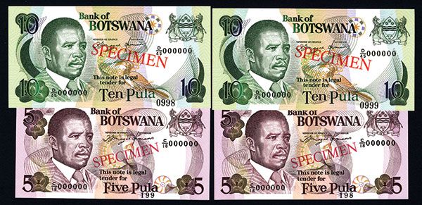 Lot of 4 notes, Includes two examples of the following notes, 5 Pula, P-8 and 10 Pula, P-9 both Unlisted specimen varieties, both with large Specimen overprints, S/N C/18 000000 and D/45 000000, All in Gem Uncirculated condition. TDLR.