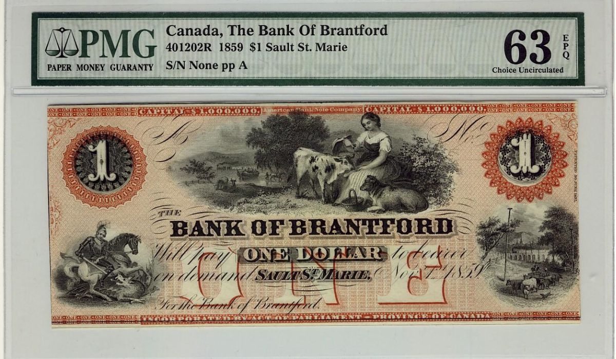 Bank of Brantford, 1859 $1 CH-40-12-02R. PMG UNC63EPQ.