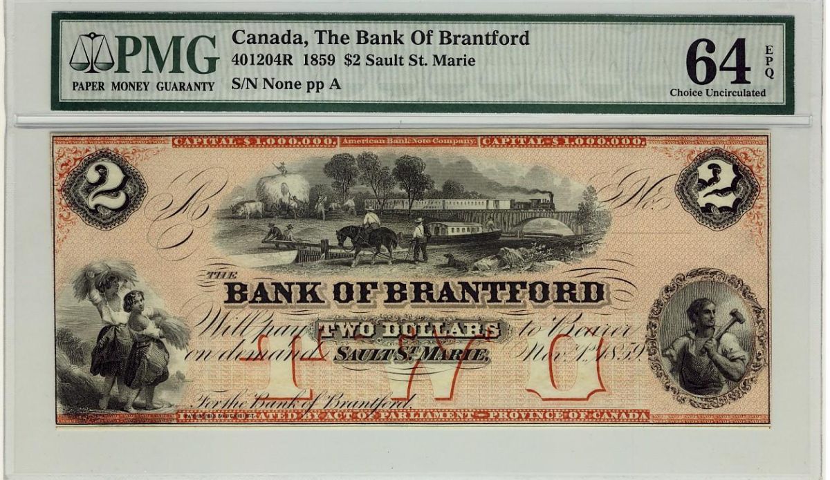 Bank of Brantford, 1859 $2 CH-40-12-04R. PMG UNC64EPQ.