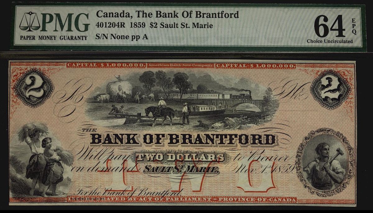 Bank of Brantford, 1859 $2 CH-40-12-04R. PMG UNC64EPQ.