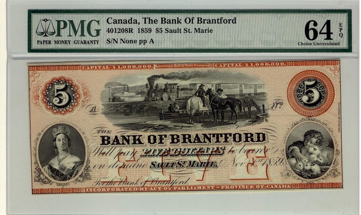 Bank of Brantford, 1859 $5 CH-40-12-08R. PMG UNC64EPQ.