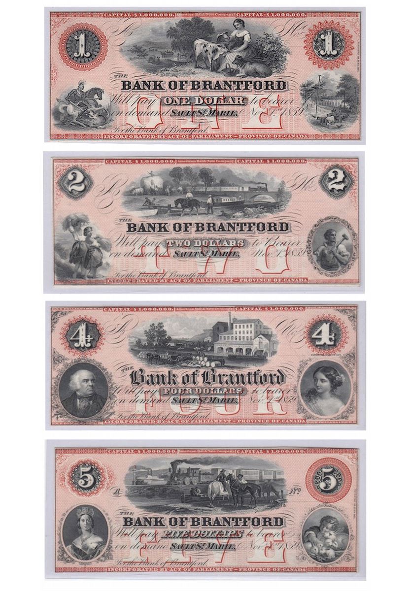 Bank of Brantford Set; 1859 $1 CH-40-12-02R BCS Choice UNC62, $2 CH-40-12-04R BCS Choice UNC62, $4 CH-40-12-06R BCS Choice UNC63, $5 CH-40-12-08R BCS Choice UNC62, Payable at Sault St. Marie, Red Tint Remainder. Complete Set in excellent condition!
