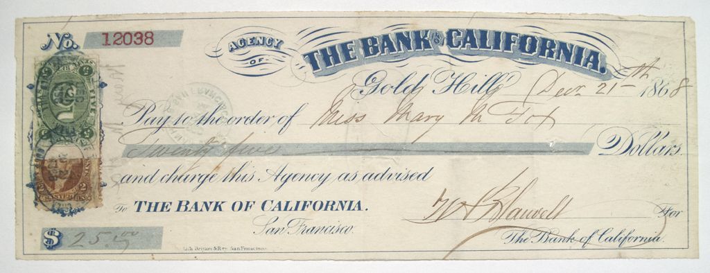Bank of California 1868 Gold Hill check with 5 cent state revenue stamp
