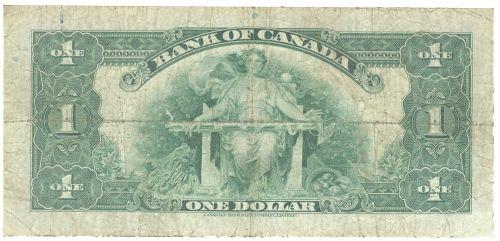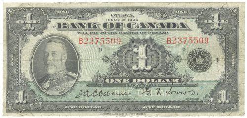 Bank of Canada $1.00 note 1935 in Fine, BC-1 english, Osborne Towers, serial B2375509. Complete corners and no pin hole.