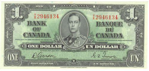 Bank of Canada $1.00 note 1937 in Uncirculated, BC-21c, Gordon Towers, T/A2946134.
