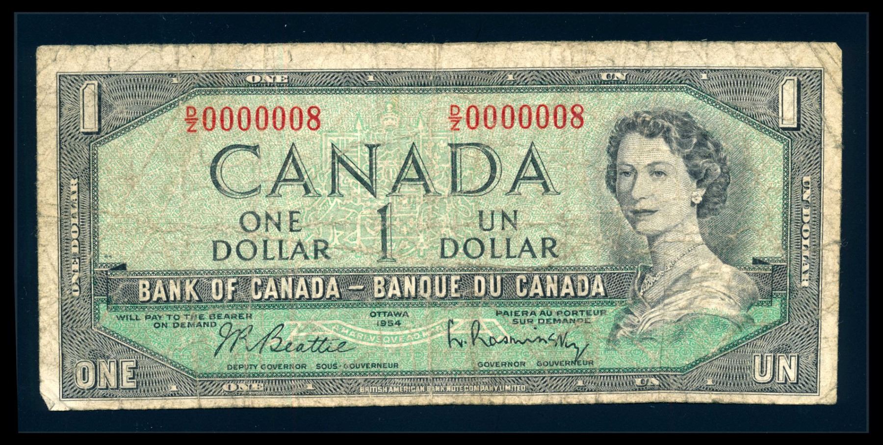 Bank of Canada $1.00 1954 BC-37b-iN5-iv Low Serial Number Fine