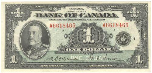 Bank of Canada $1.00 note 1935 in bright Extra-Fine, BC-1 english, Osborne Towers, serial A6618465.