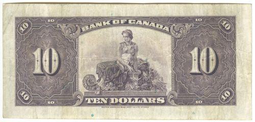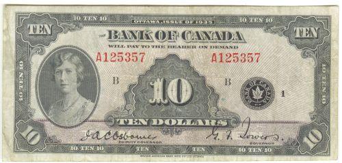 Bank of Canada $10.00 note 1935 in Very-Fine, BC-7, Osborne Towers, serial A125357. Complete corners and no pin hole.