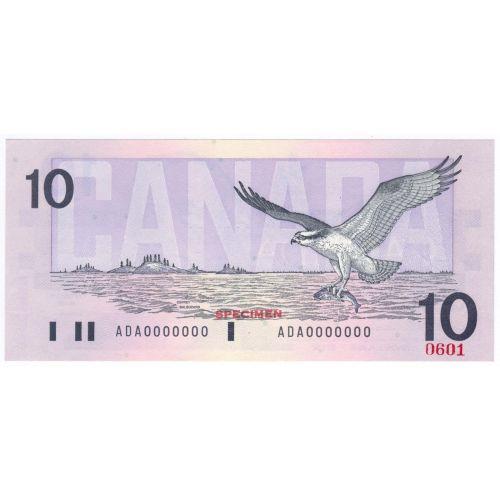 Bank of Canada, $10.00 Specimen note 1989, grade UNC, Charlton # BC-57aS, signature Thiessen Crow, serial ADA0000000, Specimen 0601. Problem free note.