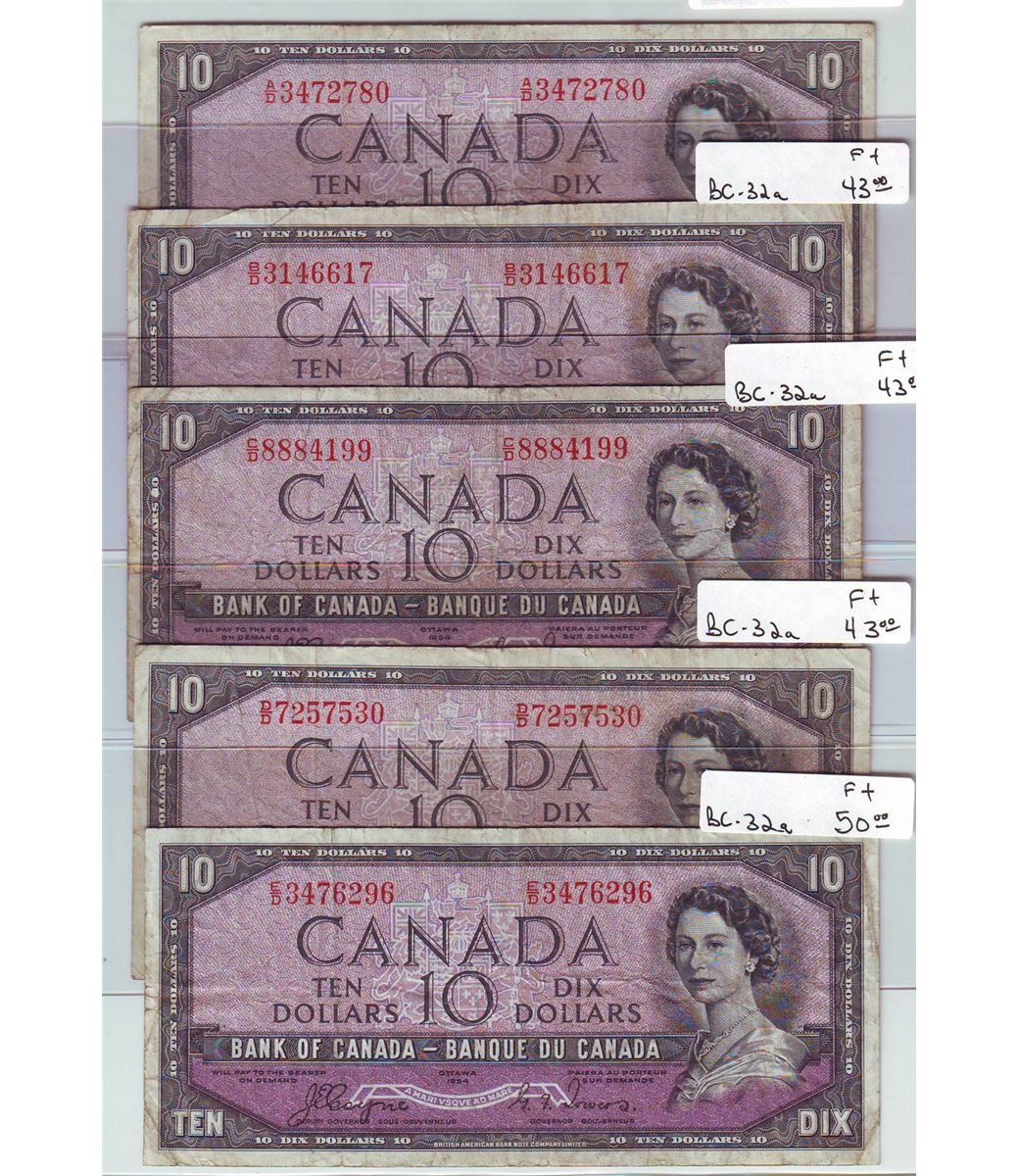Bank of Canada; 10 dollars 1954 Devil's Face BC-32a all in Fine + A/D3472780, B/D3146617, C/D8884199, D/D7257530 & E/D3476296. complete set of prefix for this set of signature, 5 notes.