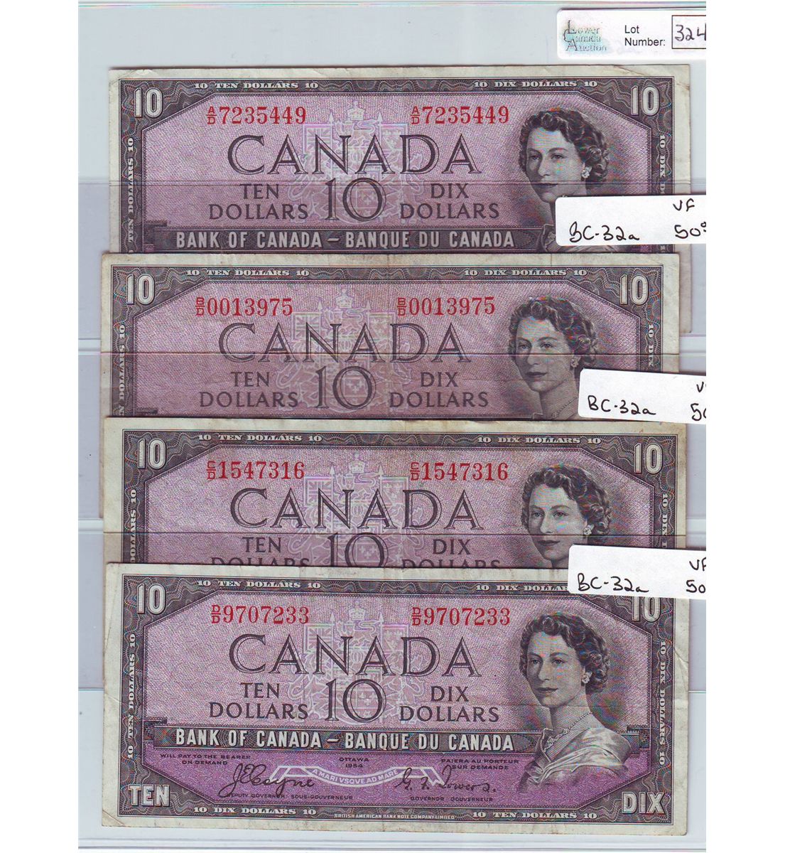 Bank of Canada; 10 dollars 1954 Devil's Face BC-32a all in Very-Fine A/D7235449, B/D0013975, C/D1547316, D/D9707233, lot of 4 notes.
