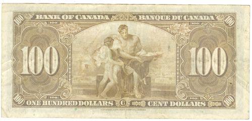 Bank of Canada $100.00 note 1937 in Very-Fine/Extra Fine, BC-27b, Gordon Towers, serial B/J3523460. Better than VF but too ruffled to be EF.