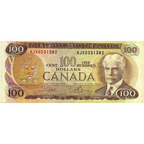 Bank of Canada, $100.00 replacement note 1975, grade F/VF, BC-52bA, signature Crow Bouey, serial AJX0331382. Small 2mm tear in lower border.