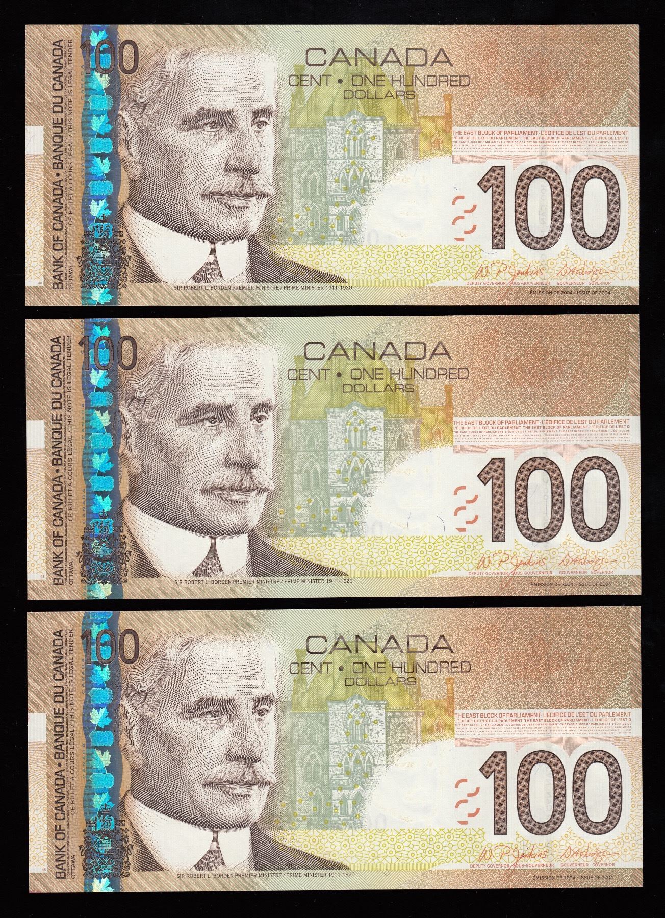 Bank of Canada $100, 2004 - Lot of 3 Consecutive