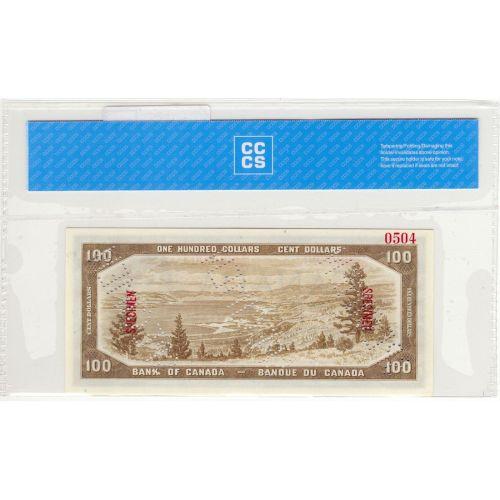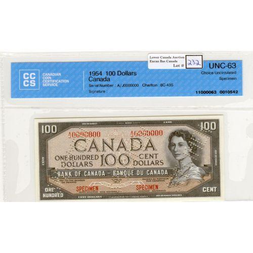 Bank of Canada, $100.00 Specimen note 1954, graded CCCS UNC-63, Charlton # BC-43S, signature Thiessen Crow, serial A/J0000000, Specimen 0504. Problem free note with only 1 minor handling nicks. Only 12 of those specimen notes have been on the market.
