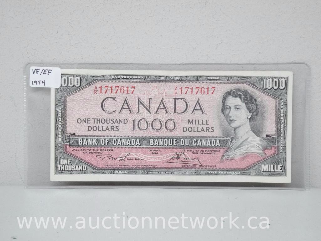 Bank of Canada $1000.00 One Thousand Dollars VF/EF 1954 Note (A/K 1717617)