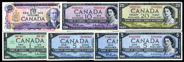 Canada, small collection of older issued notes, includes 1 Dollar, P-84a, UNC; 5 Dollars, P-77b, 2 pcs, choice VF and better; 10 Dollars, P-79b, choice AU; 20 Dollars, P-80b, VF; and 10 Dollars, P-88d, UNC.
