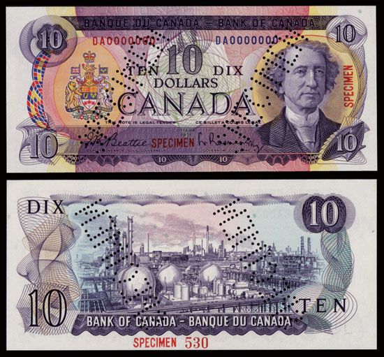 Canada, 1971, $10, P-88as, (BC-49aS), Unlisted ÒSpecimenÓ, Purple and m/c with portrait of MacDonald on right, oil refinery at back, Red ÒSpecimenÓ overprints and pin-punch specimen overprints, PMG graded Ò66 Gem Uncirculated - EPQ (Exceptional Paper Quality)Ó. Rare specimen in high grade.