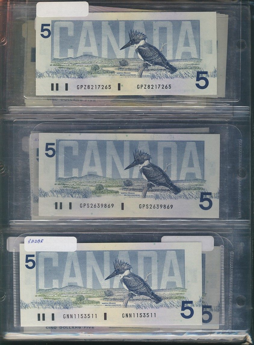 Bank of Canada 1986 $5 Banknote Lot. Includes 41 pcs, some replacement.s and some better prefixes. Mainly UNC's