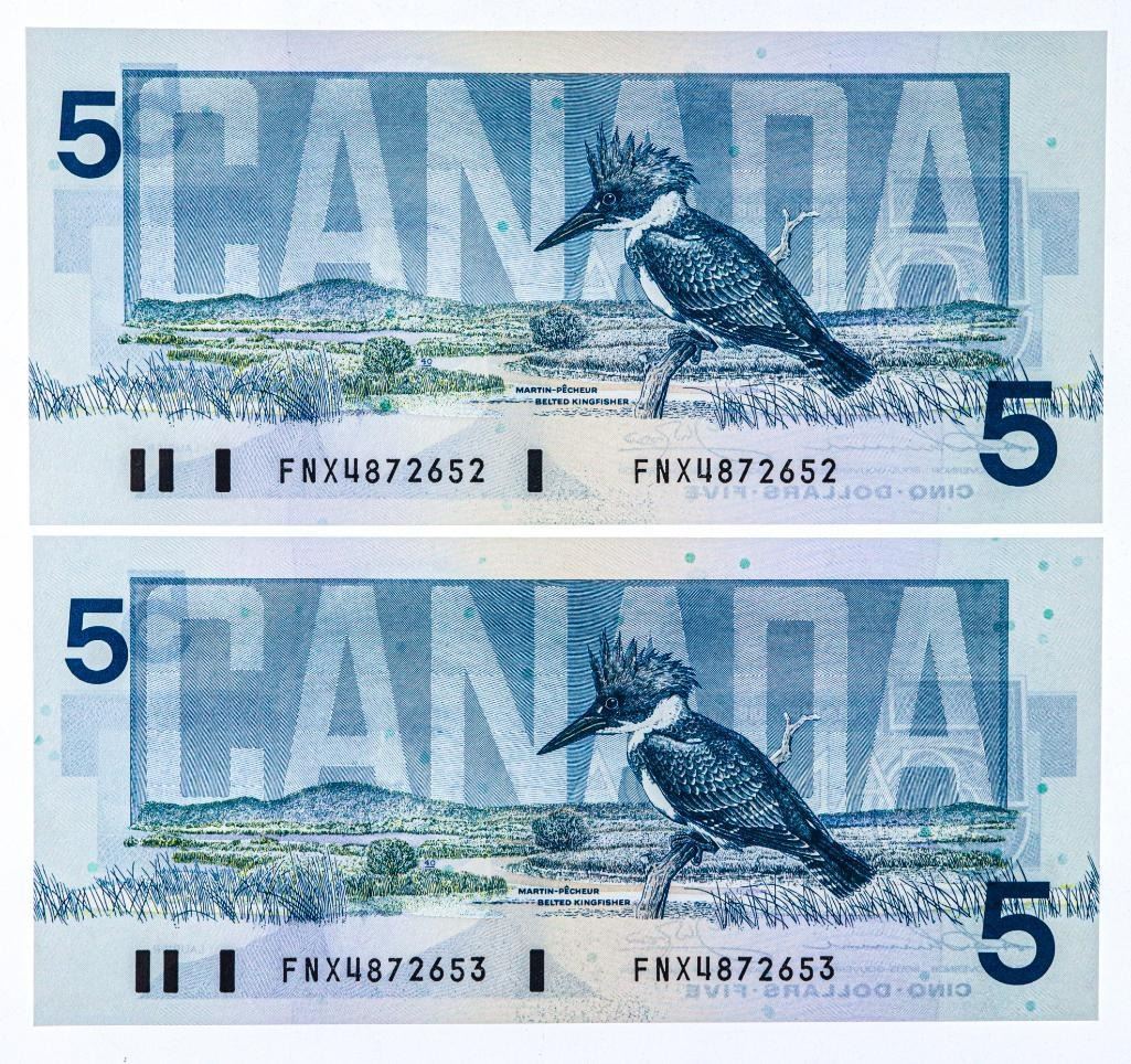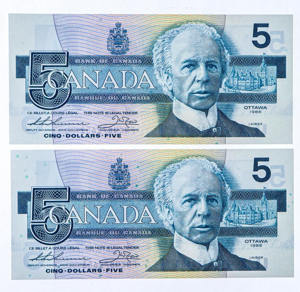 Bank of Canada 1986 $5 GEM UNC 2 in Sequence