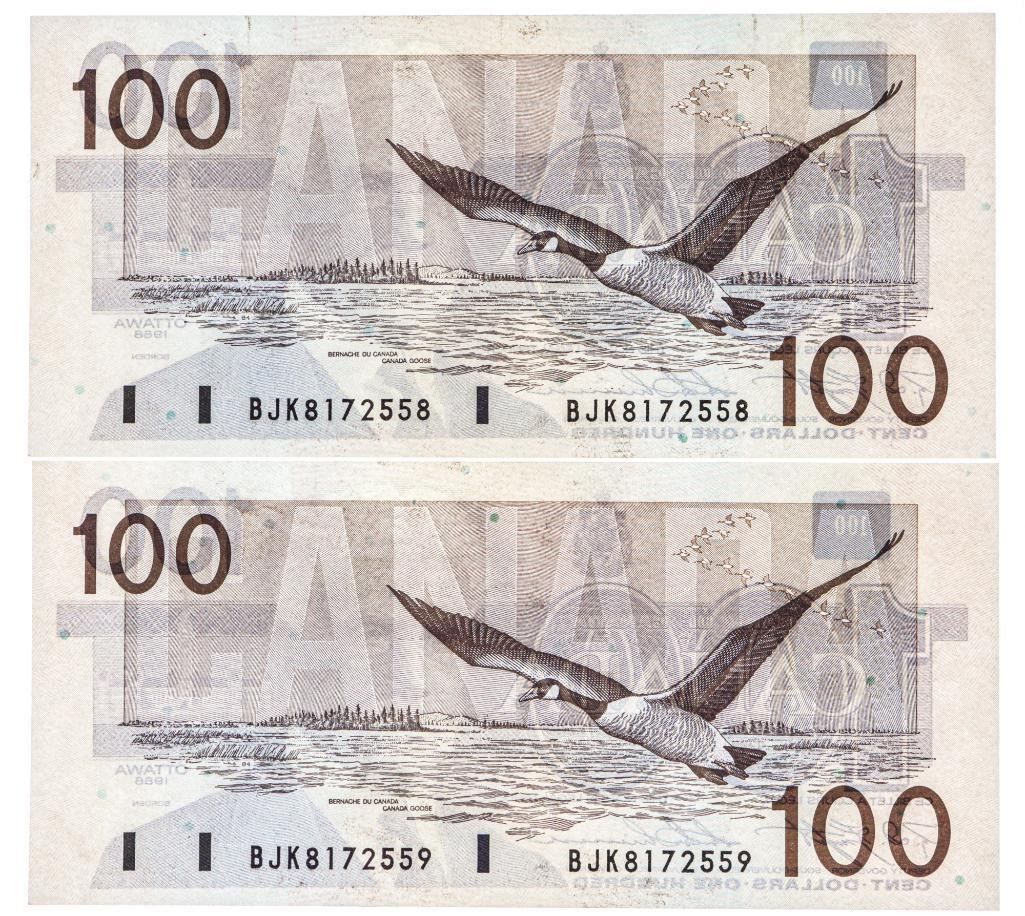 Bank of Canada 1988 $100 - Lot 2 In Sequence (BJK)