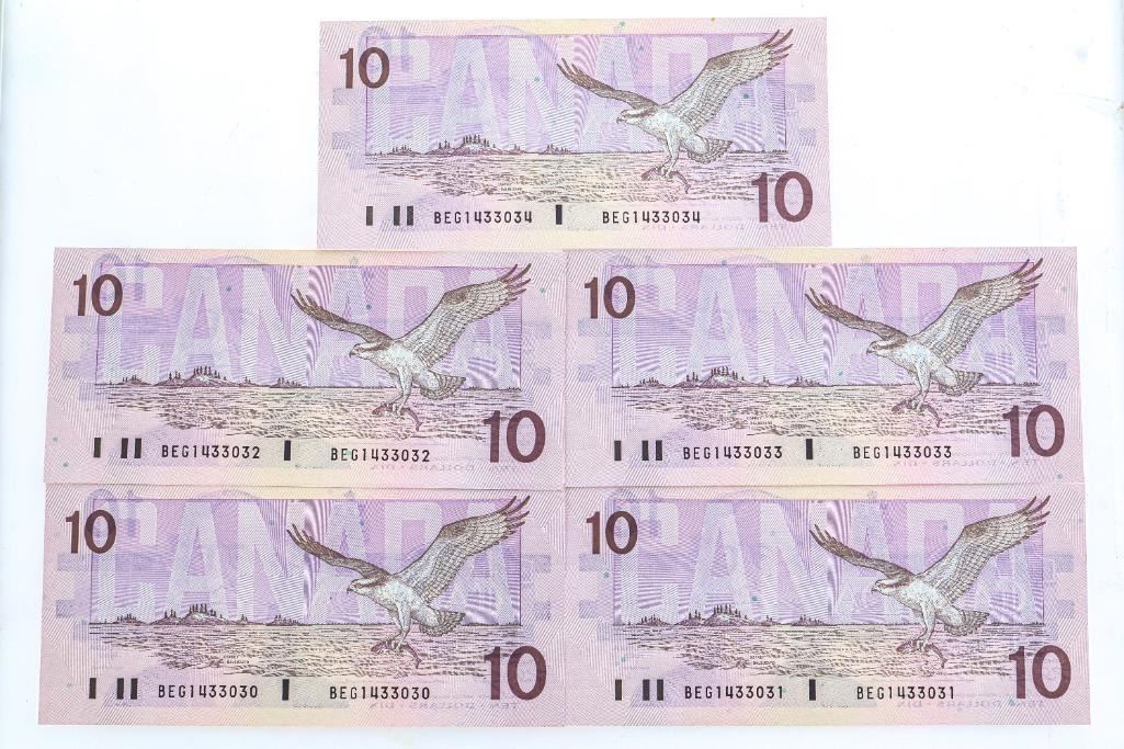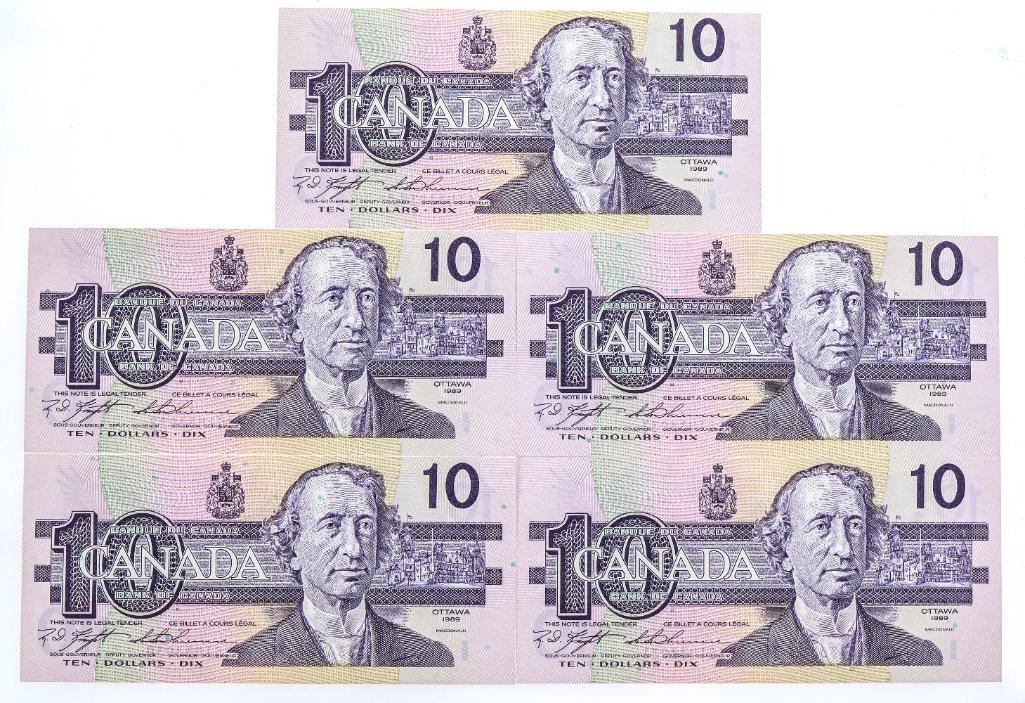 Bank of Canada 1989 Ten Dollars - (5) Notes in Sequence (BEG) GEM UNC