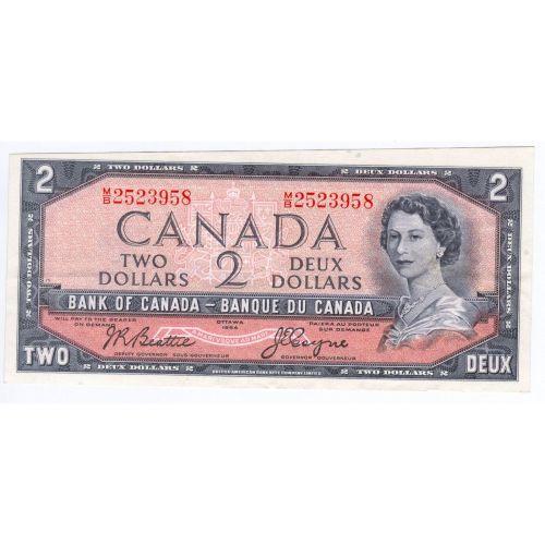 Bank of Canada, $2.00 Error note 1954, grade Very-Fine, Charlton # BC-38a, signature Beattie Coyne, serial M/B2523958. Off Center with a slanted top border.