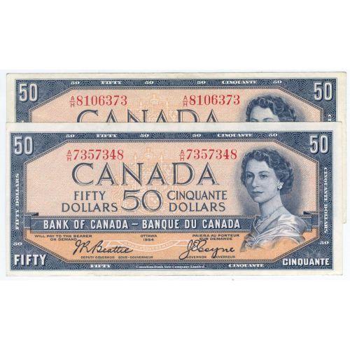 Bank of Canada, 2 x $50.00 note 1954, grade Extra-Fine, Charlton # BC-42a, signature Coyne Towers, serial A/H7357348 & A/H8106373. Pair of $50.00 note.