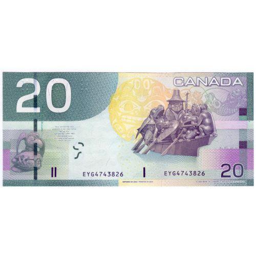Bank of Canada, $20.00 Error note 2004, grade UNC, Charlton # BC-64a-i, signature Jenkins Dodge, serial EYG4743826. Ink smear on the front of the note and some on the reverse, look to have been present on the paper before printing.