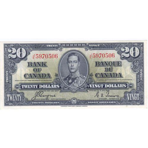 Bank of Canada, $20.00 note 1937, grade AU-UNC, Charlton # BC-25c, signature Coyne Towers, serial J/E5970506.