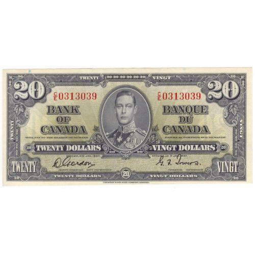 Bank of Canada, $20.00 note 1937, grade UNC, Charlton # BC-25b, signature Gordon Towers, serial C/E0313039.