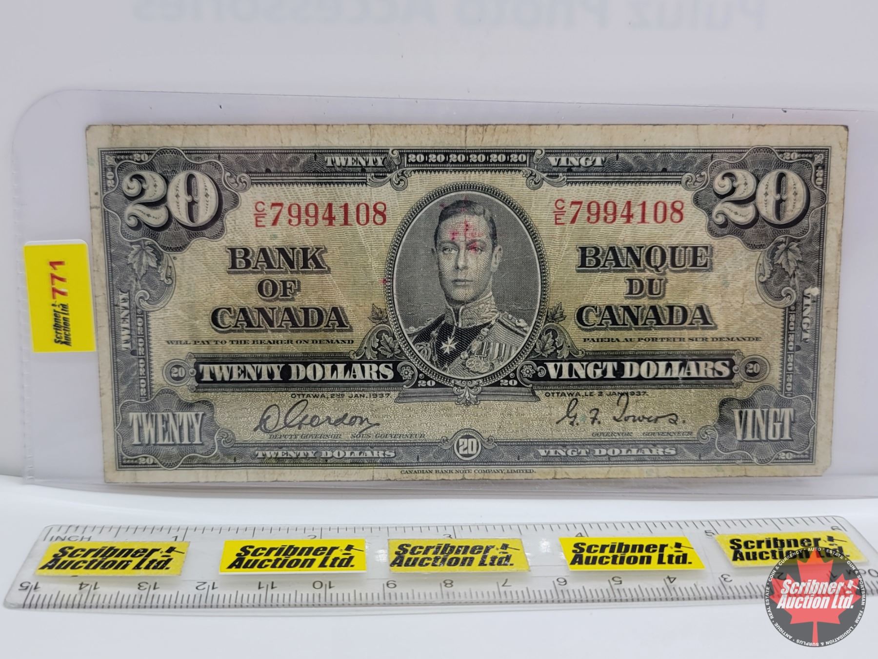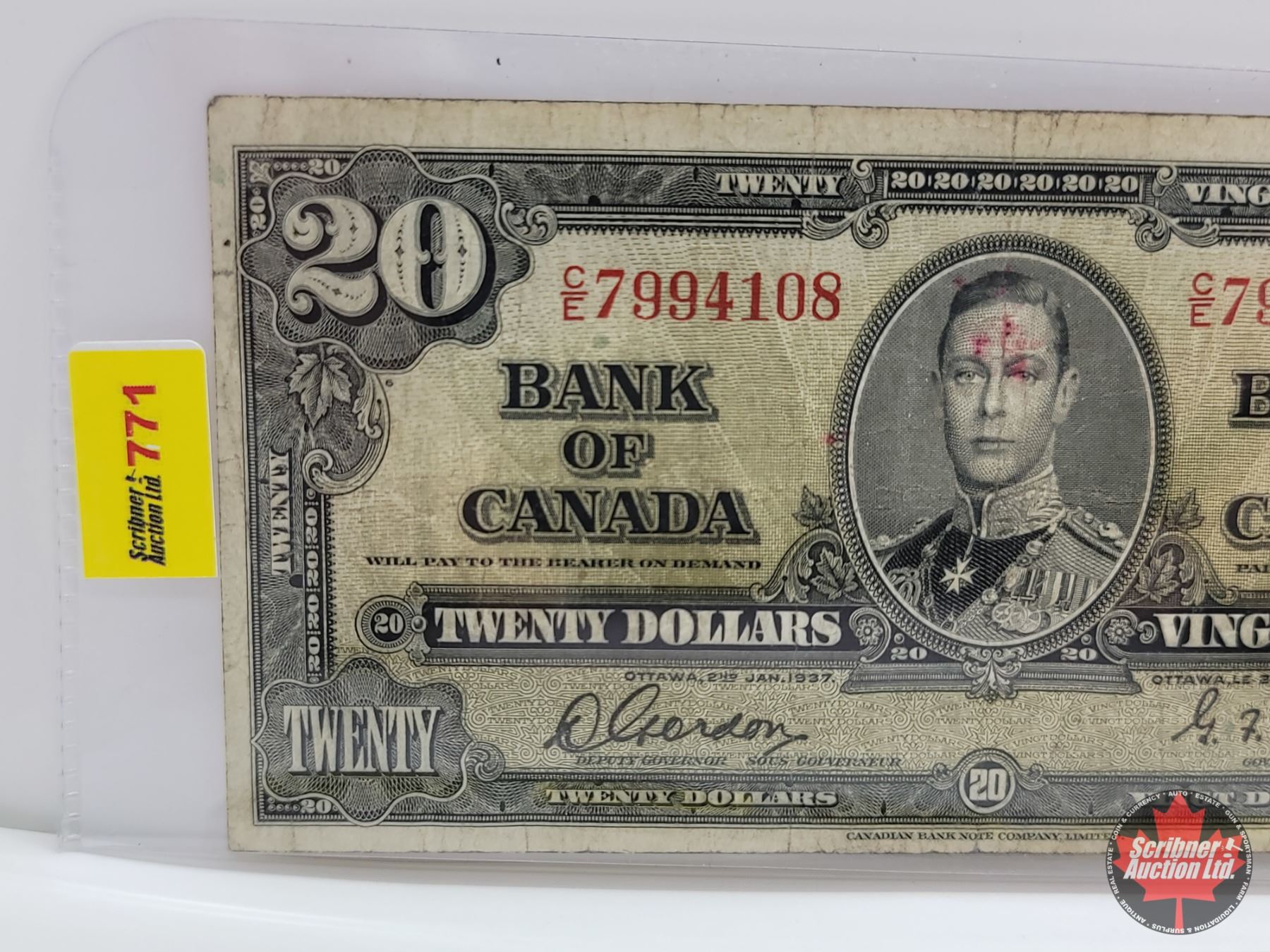 Bank of Canada $20 Bill 1937 : Gordon/Towers #CE7994108 (See Pics for Varieties, Conditions, Serial Numbers & Signatures)