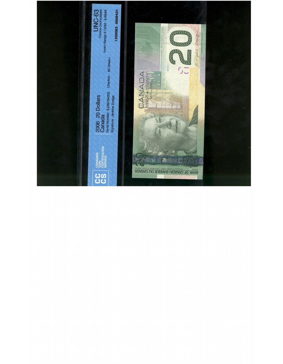Bank of Canada, $20 Insert note 2006, graded CCCS UNC-63, Charlton # BC-64aA-i, signature Jenkins Dodge, serial EZR9794002, insert range 9.720M - 9.990M. Problem free note.