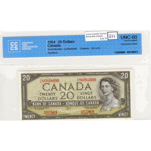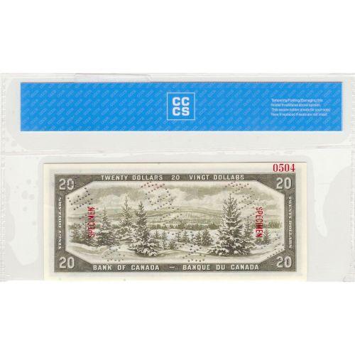 Bank of Canada, $20.00 Specimen note 1954, graded CCCS UNC-60, Charlton # BC-41S, signature Thiessen Crow, serial A/E0000000, Specimen 0504. Problem free note with only 2 minor handling nicks. Only 12 of those specimen notes have been on the market.