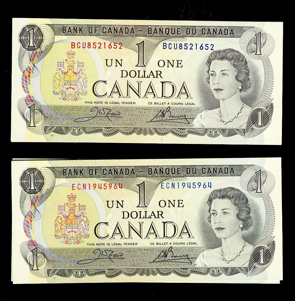 Bank of Canada, 20 x $1.00 consecutive notes 1973, grade AU to Gem UNC, Charlton # BC-46b, signature Crow Bouey, serial ECN1945964 to ECN1945983 + 16 x $1.00 consecutive notes 1973, grade AU to Gem UNC, Charlton # BC-46b, signature Crow Bouey, serial BCU
