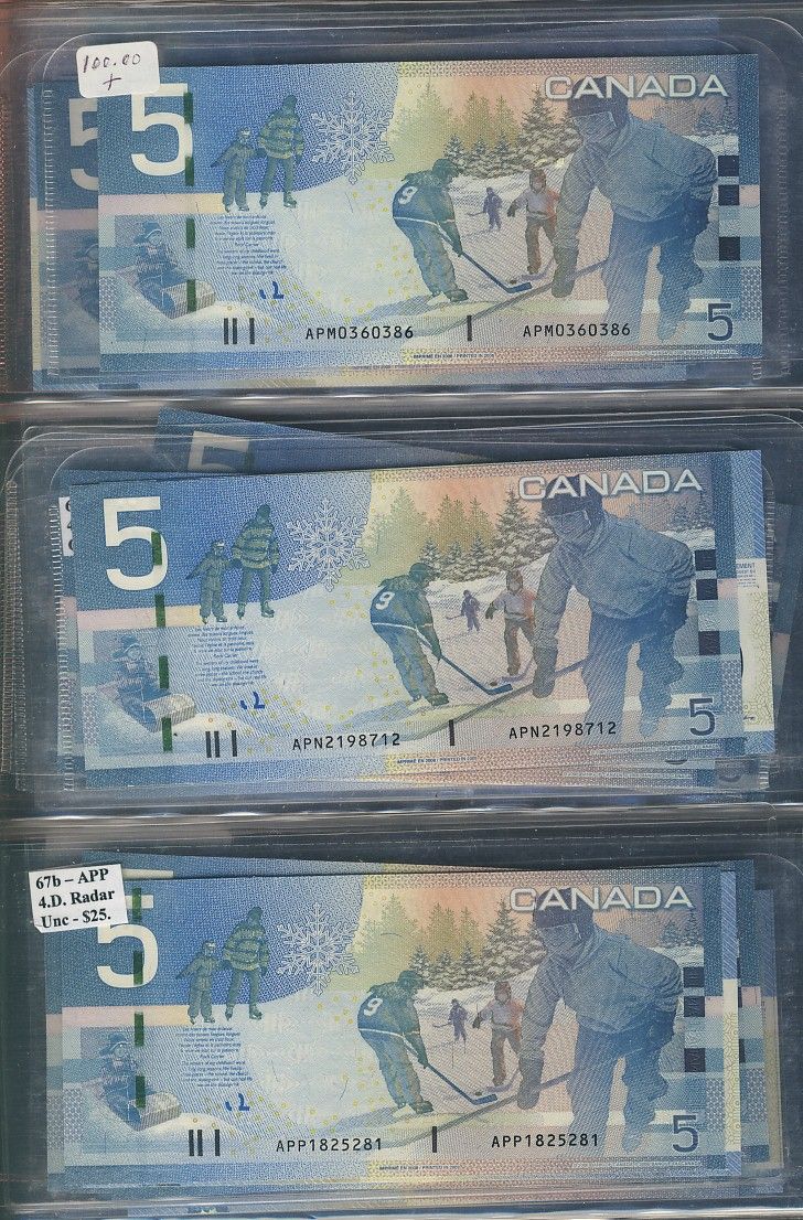 Bank of Canada 2005-2010 $5 Banknote Lot. Includes RADAR issues & some particular number series. 43 Mainly UNC. (fc $215)