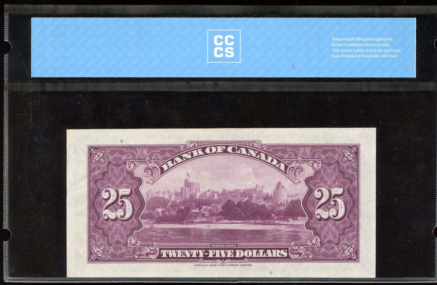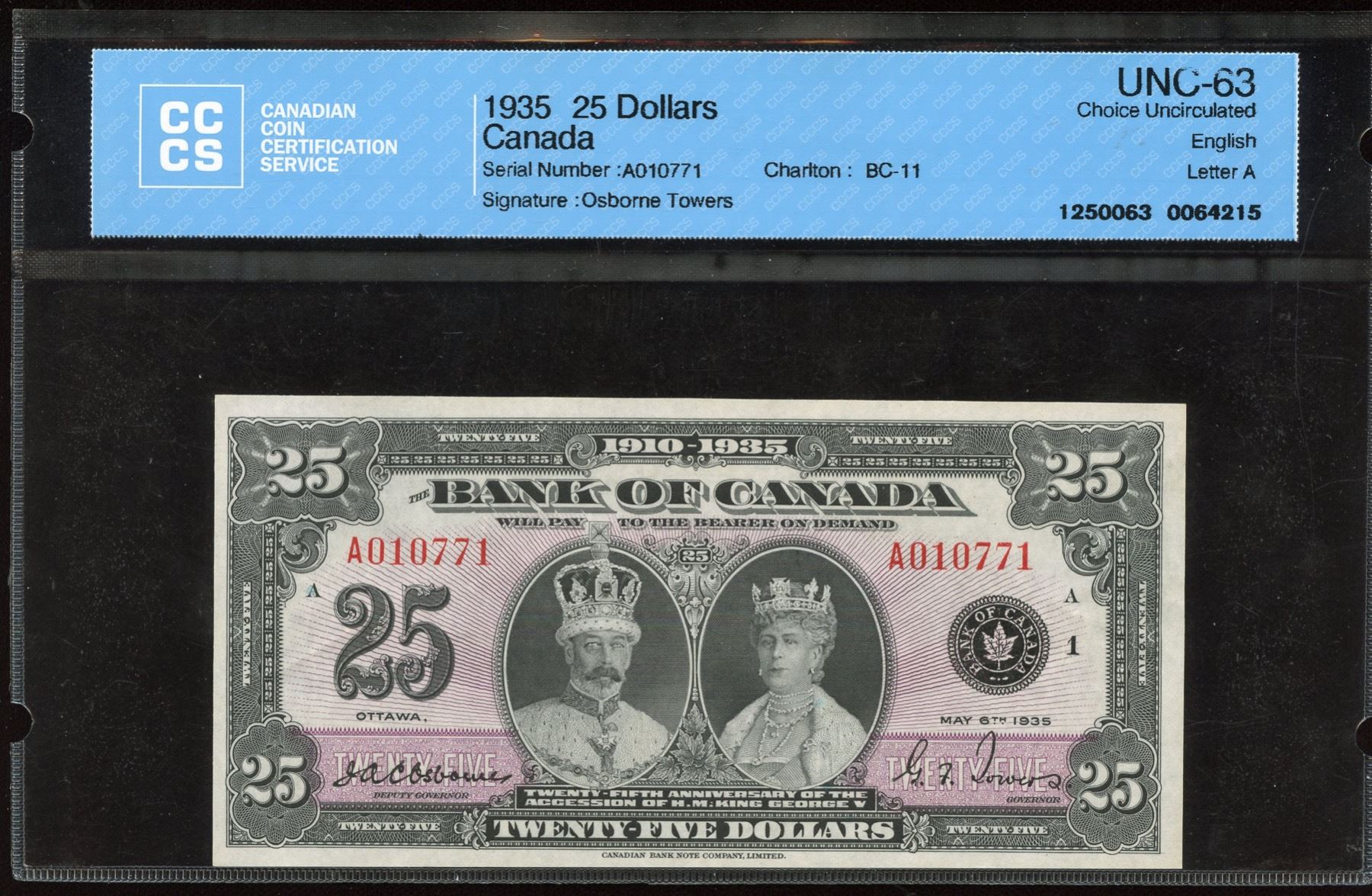 BC-11. CCCS UNC-63. A true Unc. with lots of embossing. Canada’s sought after commemorative $25 note featuring King George V & Queen Mary, and Windsor castle on back. An elite note for the advanced collector. S/N: A010771/A.