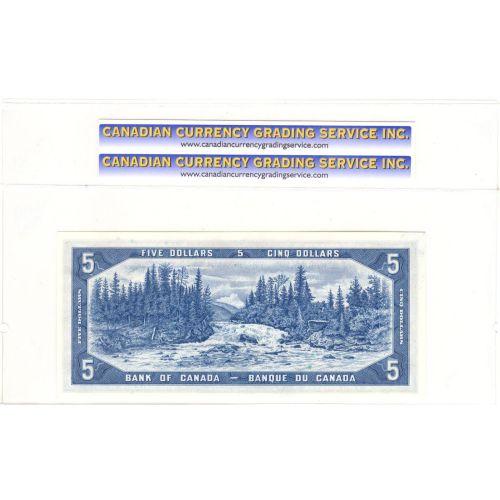 Bank of Canada, $5.00 Devil's Face note 1954, graded CCCS UNC63, Charlton # BC-31a, signature Coyne Towers, serial A/C0000344. Nice low serial note.