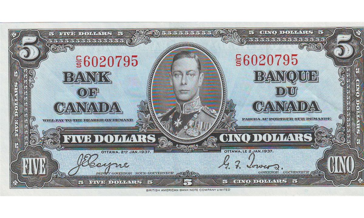 Bank of Canada; 5 dollars 1937 BC-23c Coyne Towers C/S6020795 in VF-35, look UNC with 3 light folds.