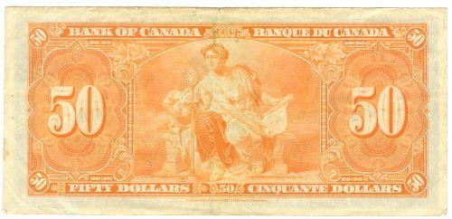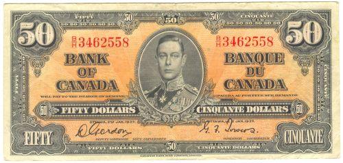 Bank of Canada $50.00 note 1937 in Very-Fine, BC-26b, Gordon Towers, serial B/H3462558. Fairly clean note.