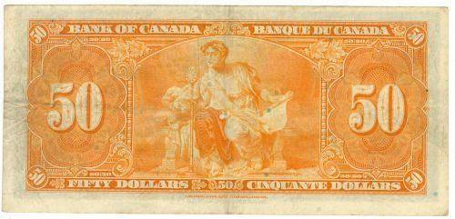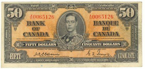 Bank of Canada $50.00 note 1937 in Very-Fine, BC-26a, Osborne Towers, serial A0065126. Faint trace of bank stamp on front, hard to see.