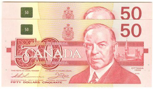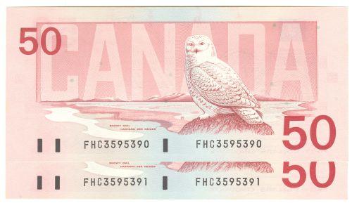 Bank of Canada $50.00 note 1988 in Uncirculated, BC-59a, Thiessen Crow, FHC3595390 & FHC3595391. 2 consecutive notes.