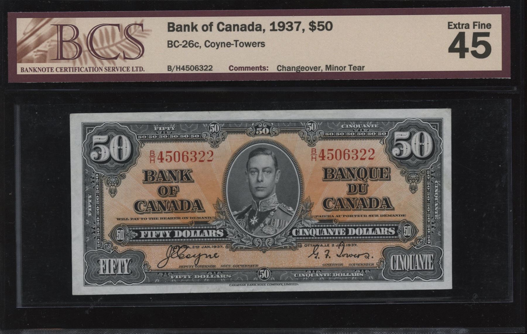 BC-26c. BCS EF45. Changeover, minor tear. S/N:B/H4506322.