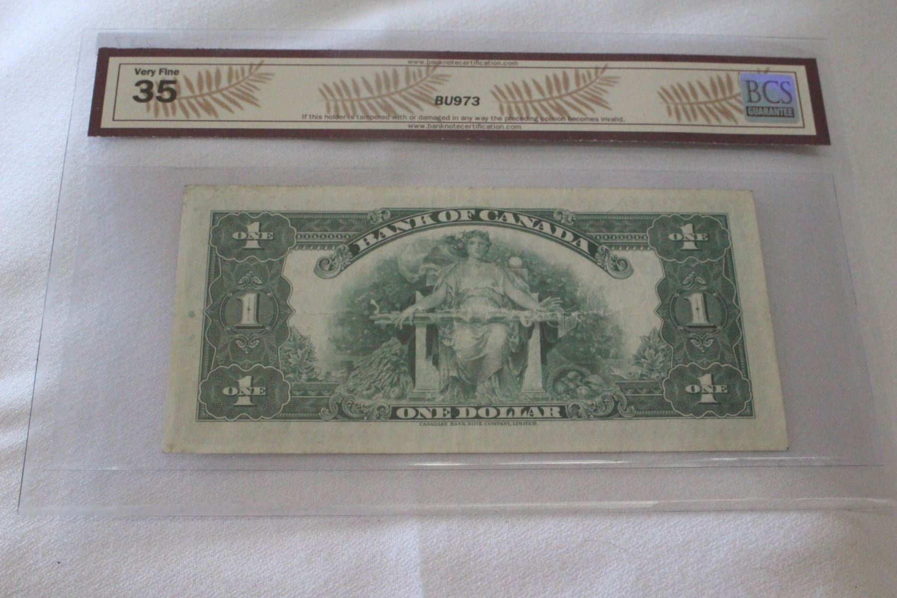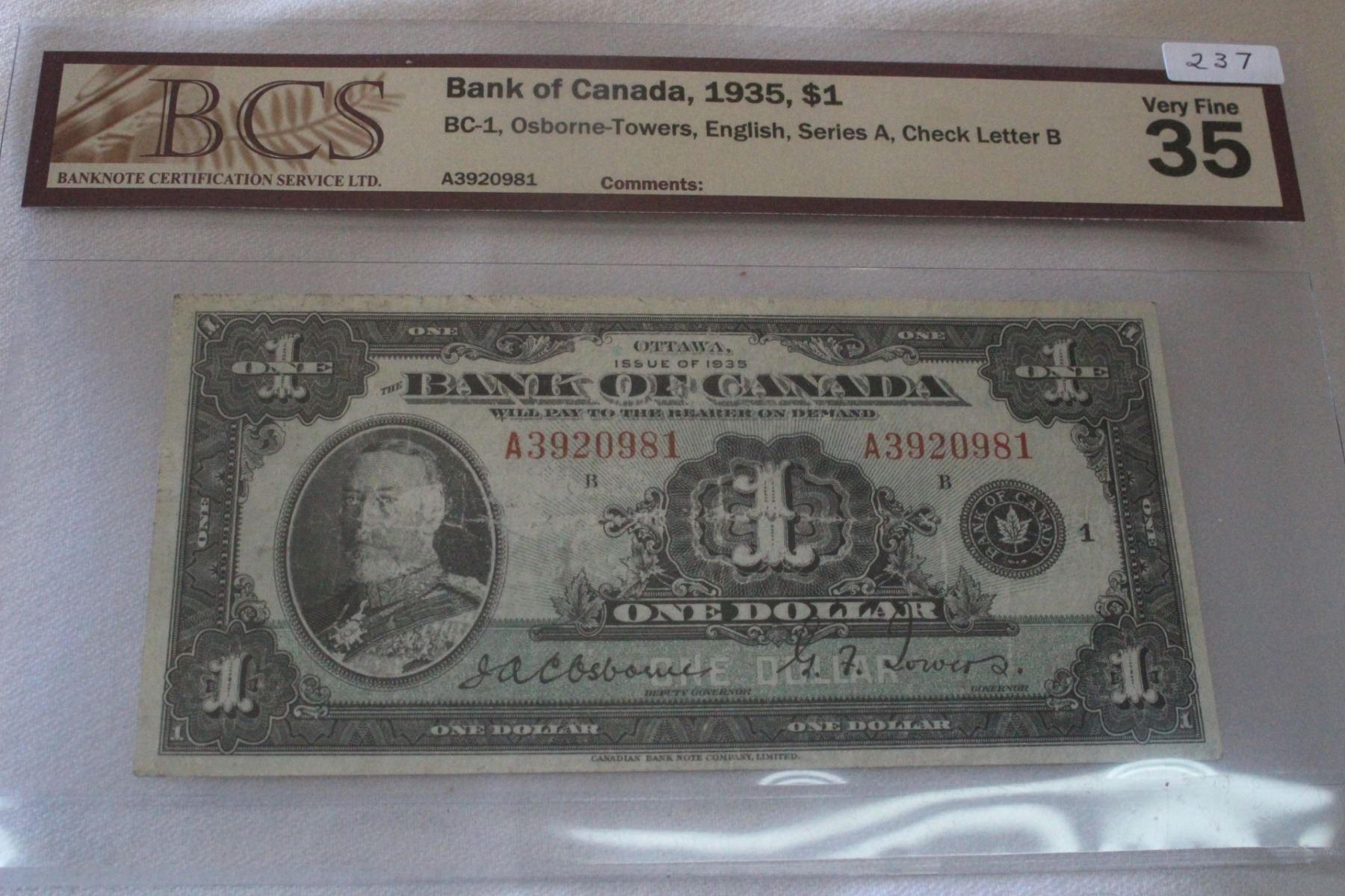1935; Osbourne/Towers; A3920981; Graded '35VF' by Banknote Certification Service Ltd.