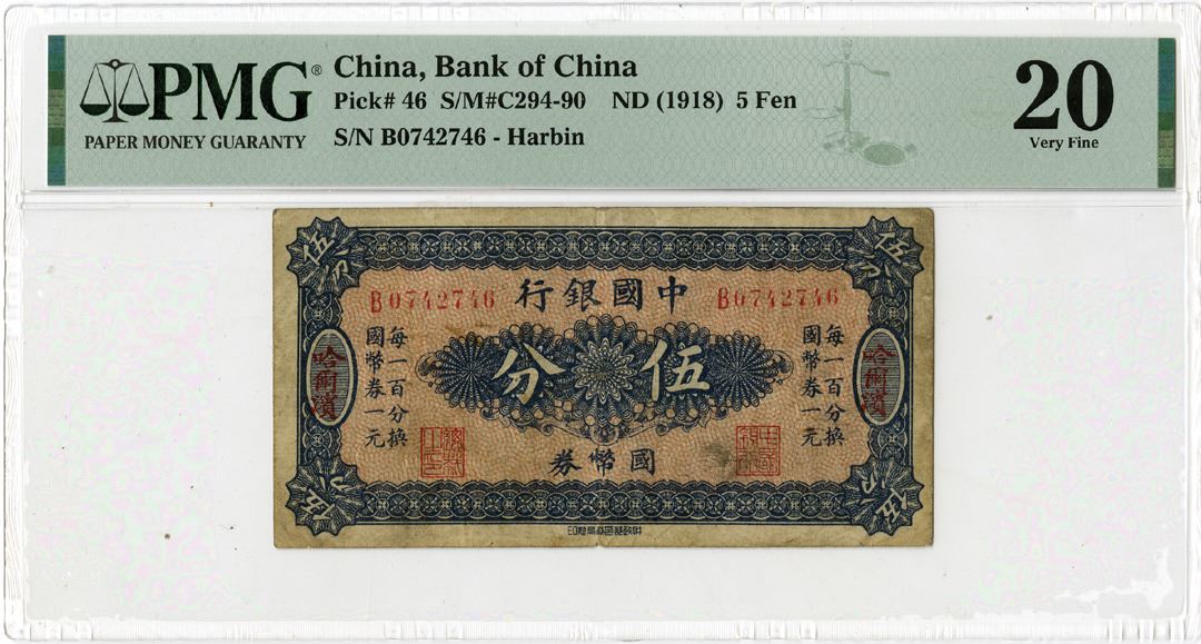 Harbin, China, ND (1918). 5 Fen, P-46 S/M#C294-90, Issued banknote, Blue on red underprint, S/N B0742746, PMG graded Very Fine 20, Chinese Printer, Rare note in any condition.