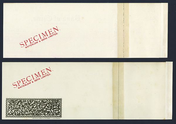China. Two checks, one on Shanghai the other on FooChow branch. Both with Waterlow & Sons Ltd. Specimen imprint on back. Tape on back on tab perforations. Mounting remnant at tab end. Extremely Fine. 2 pieces.