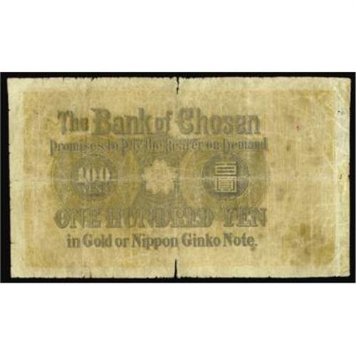 <style type="text/css"> body, td, th { font-family: Arial, Helvetica, sans-serif; font-size: 12px; color: #482424; margin: 0px; padding: 0px; } #header { background-image: url(http://www.bowersandmerena.com/ebay/images/template_v3_01.gif); clear: both; background-color: #590303; border-top-width: 2px; border-top-style: solid; border-top-color: #B38C4F; } #header #header_wrapper { height: 75px; clear: both; width: 800px; margin-right: auto; margin-left: auto; background-image: url(http://www.bowersandmerena.com/ebay/images/template_v3_03.gif); background-repeat: no-repeat; background-position: right; color: #F3EDCC; } #header #header_wrapper #header_logo { float: left; height: 75px; width: 444px; background-image: url(http://www.bowersandmerena.com/ebay/images/template_v3_02.gif); background-repeat: no-repeat; font-size: 10px; text-transform: capitalize; color: #B38C4F; } #header #header_wrapper #header_right { float: left; height: 75px; width: 356px; text-align: right; } #header #header_wrapper #header_right #headerLoginBtn { margin-bottom: 30px; } #header #header_wrapper #header_right input#txtSearch { color: #B49056; border: 1px solid #B49056; width: 175px; padding-top: 3px; padding-right: 3px; padding-bottom: 4px; padding-left: 3px; } #nav { height: 37px; background-image: url(http://www.bowersandmerena.com/ebay/images/template_v3_05.gif); clear: both; } #nav #nav_wrapper { height: 35px; width: 800px; margin-right: auto; margin-left: auto; border-left-width: 1px; border-left-style: solid; border-left-color: #B38C4F; } #nav #nav_wrapper a { padding-right: 15px; padding-left: 15px; border-right-width: 1px; border-right-style: solid; border-right-color: #B38C4F; height: 25px; padding-top: 10px; display: block; float: left; text-decoration: none; font-weight: bold; color: #5D0303; } #nav #nav_wrapper a:hover { color: #B38C4F; } #nav #nav_wrapper #search { float: right; padding-top: 7px; } #nav #nav_wrapper #search #txtSearch { font-family: Arial, Helvetica, sans-serif; font-size: 10px; text-transform: uppercase; color: #D2AE75; border: 1px solid #B38C4F; padding: 3px; } #content_bgd { background-image: url(http://www.bowersandmerena.com/ebay/images/template_v3_09.gif); background-repeat: repeat-y; background-position: center; padding-top: 15px; padding-bottom: 15px; background-color: #FBFBDB; } #content_wrapper { clear: both; height: auto; width: 800px; margin-right: auto; margin-left: auto; } .LotDetailWhite { line-height:normal; font-size:13px; font-family: arial,helvetica,sans-serif; color: White; font-weight: bold; } .LotDetailInformation { line-height:normal; font-size: 13px; font-family: arial,helvetica,sans-serif; } .LotDetailMessage { line-height:normal; font-size: 13px; font-family: arial,helvetica,sans-serif; color: red; } } tr.HeaderAuctionTitle td { color: #000000; font-weight: bold; padding: 2px; background-image: url(http://www.bowersandmerena.com/ebay/images/template_v3_05.gif); background-repeat: repeat-x; border-bottom-width: 1px; border-bottom-style: solid; border-bottom-color: #B38C4F; } table.AuctionSummary a, table.AuctionSummary a:link, table.AuctionSummary a:visited { color: #0000FF; text-decoration: none; } } td.tableHeaderLeft { border-left-width: 1px; border-left-style: solid; border-left-color: #B38C4F; } td.tableHeaderRight { border-right-width: 1px; border-right-style: solid; border-right-color: #B38C4F; } td.tableCellMiddle { border-left-width: 1px; border-left-style: solid; border-left-color: #B38C4F; border-right-width: 1px; border-right-style: solid; border-right-color: #B38C4F; padding: 5px; } tr.footer td { border-top-width: 1px; border-top-style: solid; border-top-color: #B38C4F; } </style> </head> <body> <div id="header"> <div id="header_wrapper"> <div id="header_logo"> </div> <div id="header_right"> </div> </div> </div> <div id="nav"> <div id="nav_wrapper"> <a href="http://www.bowersandmerena.com">Our eBayLive Auctions</a> <a href="#PaymentInfo">Payment Information</a> <a href="#ShippingInfo">Shipping Information</a> <a href="#About">About Bowers and Merena</a> </div> </div> <div id="content_bgd"> <div id="content_wrapper"> <table width="100%" border="0" cellpadding="5" cellspacing="0" class="AuctionSummary"> <tbody> <tr class="HeaderAuctionTitle" style="height: 25px;"> <td align="left" class="tableHeaderLeft" > </td> <td align="center" class="tableHeaderRight"> <span style="font-size: large;">Lot #1059. Korea. Bank of Chosen, 1911 (1914) First Issue.</span> </td> </tr> <tr> <td colspan="3" class="tableCellMiddle"> 1911 (1914), 100 Yen, P-16A, Japanese unstylized numerals, VG+ to Fine, small separations of vertical fold on top and bottom edges. A pleasing example of this difficult note.