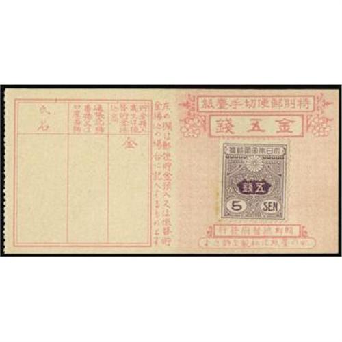 <style type="text/css"> body, td, th { font-family: Arial, Helvetica, sans-serif; font-size: 12px; color: #482424; margin: 0px; padding: 0px; } #header { background-image: url(http://www.bowersandmerena.com/ebay/images/template_v3_01.gif); clear: both; background-color: #590303; border-top-width: 2px; border-top-style: solid; border-top-color: #B38C4F; } #header #header_wrapper { height: 75px; clear: both; width: 800px; margin-right: auto; margin-left: auto; background-image: url(http://www.bowersandmerena.com/ebay/images/template_v3_03.gif); background-repeat: no-repeat; background-position: right; color: #F3EDCC; } #header #header_wrapper #header_logo { float: left; height: 75px; width: 444px; background-image: url(http://www.bowersandmerena.com/ebay/images/template_v3_02.gif); background-repeat: no-repeat; font-size: 10px; text-transform: capitalize; color: #B38C4F; } #header #header_wrapper #header_right { float: left; height: 75px; width: 356px; text-align: right; } #header #header_wrapper #header_right #headerLoginBtn { margin-bottom: 30px; } #header #header_wrapper #header_right input#txtSearch { color: #B49056; border: 1px solid #B49056; width: 175px; padding-top: 3px; padding-right: 3px; padding-bottom: 4px; padding-left: 3px; } #nav { height: 37px; background-image: url(http://www.bowersandmerena.com/ebay/images/template_v3_05.gif); clear: both; } #nav #nav_wrapper { height: 35px; width: 800px; margin-right: auto; margin-left: auto; border-left-width: 1px; border-left-style: solid; border-left-color: #B38C4F; } #nav #nav_wrapper a { padding-right: 15px; padding-left: 15px; border-right-width: 1px; border-right-style: solid; border-right-color: #B38C4F; height: 25px; padding-top: 10px; display: block; float: left; text-decoration: none; font-weight: bold; color: #5D0303; } #nav #nav_wrapper a:hover { color: #B38C4F; } #nav #nav_wrapper #search { float: right; padding-top: 7px; } #nav #nav_wrapper #search #txtSearch { font-family: Arial, Helvetica, sans-serif; font-size: 10px; text-transform: uppercase; color: #D2AE75; border: 1px solid #B38C4F; padding: 3px; } #content_bgd { background-image: url(http://www.bowersandmerena.com/ebay/images/template_v3_09.gif); background-repeat: repeat-y; background-position: center; padding-top: 15px; padding-bottom: 15px; background-color: #FBFBDB; } #content_wrapper { clear: both; height: auto; width: 800px; margin-right: auto; margin-left: auto; } .LotDetailWhite { line-height:normal; font-size:13px; font-family: arial,helvetica,sans-serif; color: White; font-weight: bold; } .LotDetailInformation { line-height:normal; font-size: 13px; font-family: arial,helvetica,sans-serif; } .LotDetailMessage { line-height:normal; font-size: 13px; font-family: arial,helvetica,sans-serif; color: red; } } tr.HeaderAuctionTitle td { color: #000000; font-weight: bold; padding: 2px; background-image: url(http://www.bowersandmerena.com/ebay/images/template_v3_05.gif); background-repeat: repeat-x; border-bottom-width: 1px; border-bottom-style: solid; border-bottom-color: #B38C4F; } table.AuctionSummary a, table.AuctionSummary a:link, table.AuctionSummary a:visited { color: #0000FF; text-decoration: none; } } td.tableHeaderLeft { border-left-width: 1px; border-left-style: solid; border-left-color: #B38C4F; } td.tableHeaderRight { border-right-width: 1px; border-right-style: solid; border-right-color: #B38C4F; } td.tableCellMiddle { border-left-width: 1px; border-left-style: solid; border-left-color: #B38C4F; border-right-width: 1px; border-right-style: solid; border-right-color: #B38C4F; padding: 5px; } tr.footer td { border-top-width: 1px; border-top-style: solid; border-top-color: #B38C4F; } </style> </head> <body> <div id="header"> <div id="header_wrapper"> <div id="header_logo"> </div> <div id="header_right"> </div> </div> </div> <div id="nav"> <div id="nav_wrapper"> <a href="http://www.bowersandmerena.com">Our eBayLive Auctions</a> <a href="#PaymentInfo">Payment Information</a> <a href="#ShippingInfo">Shipping Information</a> <a href="#About">About Bowers and Merena</a> </div> </div> <div id="content_bgd"> <div id="content_wrapper"> <table width="100%" border="0" cellpadding="5" cellspacing="0" class="AuctionSummary"> <tbody> <tr class="HeaderAuctionTitle" style="height: 25px;"> <td align="left" class="tableHeaderLeft" > </td> <td align="center" class="tableHeaderRight"> <span style="font-size: large;">Lot #1062. Korea. Bank of Chosen, 1917 Provisional Postal Stamp Issue. </span> </td> </tr> <tr> <td colspan="3" class="tableCellMiddle"> 1917, 5 Sen postal adhesive stamp (type Tazawa) attached to a special small form perforated on left side in Unc. to CU, also included is a small manila envelope with bank information and possibly used in conjunction with this issue.