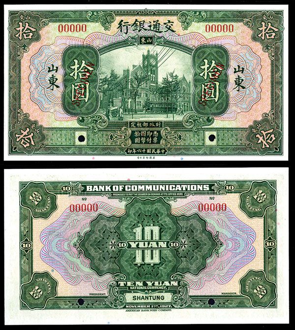 Shantung, China. 1927, 10 Yuan, P-147Bs, Specimen, Green on m/c, Maritime Customs building, back green and m/c, Specimen overprint, “00000” serial numbers and POC's. PMG graded Gem Uncirculated 66 EPQ, Exceptional Paper Quality. Scarce note in high grade. ABNC.