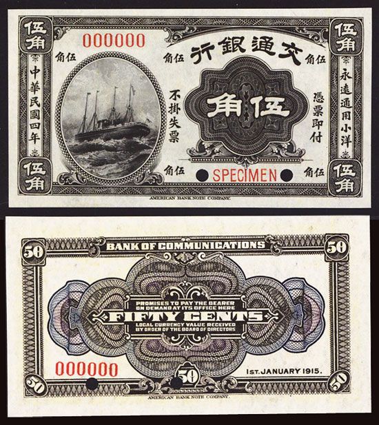 China, 1915, 50 cents, P-121s S/M#C126-, Unlisted as Specimen, No place name, Steamship on rough waters at left, black with no underprint, S/N 000000, Specimen overprints, POC's, PMG graded Gem Uncirculated 65 EPQ, rare note in any grade and this one will be difficult to improve upon. The note catalogs issued at $3000 in XF, ABNC.